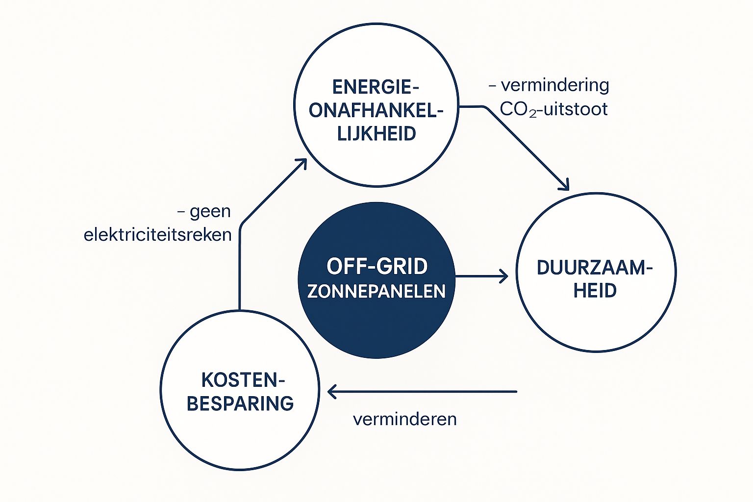 Deze afbeelding toont duidelijk hoe energieonafhankelijkheid, duurzaamheid en kostenbesparing – de drie pijlers van off-grid leven – hand in hand gaan.